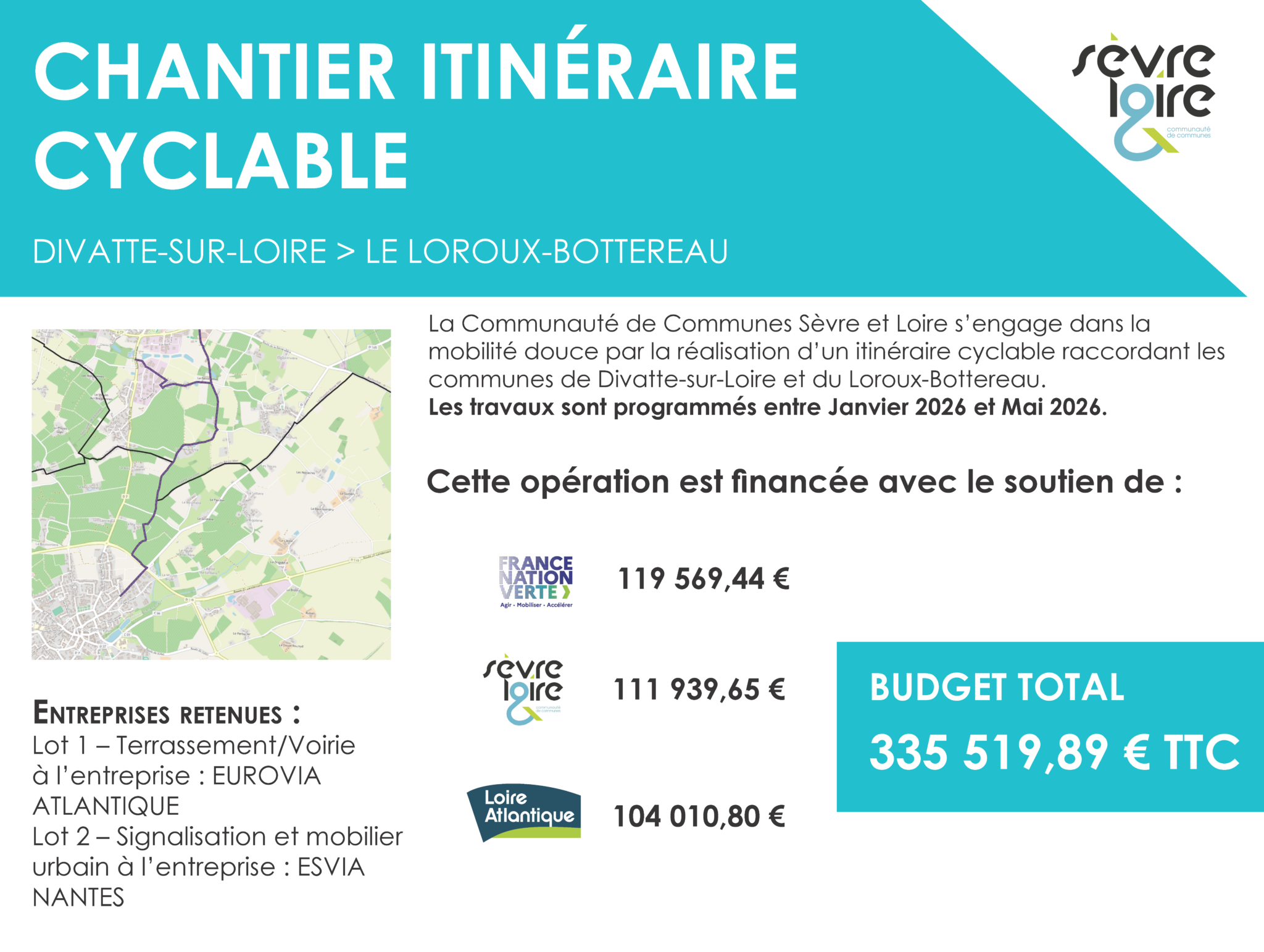 Le démarrage du chantier est prévu début 2026 pour une livraison estimée en juin 2026. Le coût total de l’opération s’élève à 335 519,89 € TTC. Le projet bénéficie d’un soutien financier du Département de Loire-Atlantique à hauteur de 104 010,80 €, ainsi que de l’État via le fonds vert pour un montant de 119 569,44 €. Le reste à charge pour la Communauté de communes Sèvre & Loire est de 111 939,65 €.
